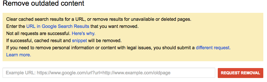 Đây là nơi công cụ này xuất hiện. Gửi URL tới Google với hy vọng nó sẽ cập nhật các máy chủ của nó xóa kết quả tìm kiếm được lưu trong bộ nhớ cache để bạn không còn liên kết với trang. Không có gì đảm bảo Google sẽ xóa thông tin được lưu trong bộ nhớ cache vì những lý do, nhưng thật đáng để thử xua đuổi càng nhiều sự hiện diện của bạn càng tốt từ internet.