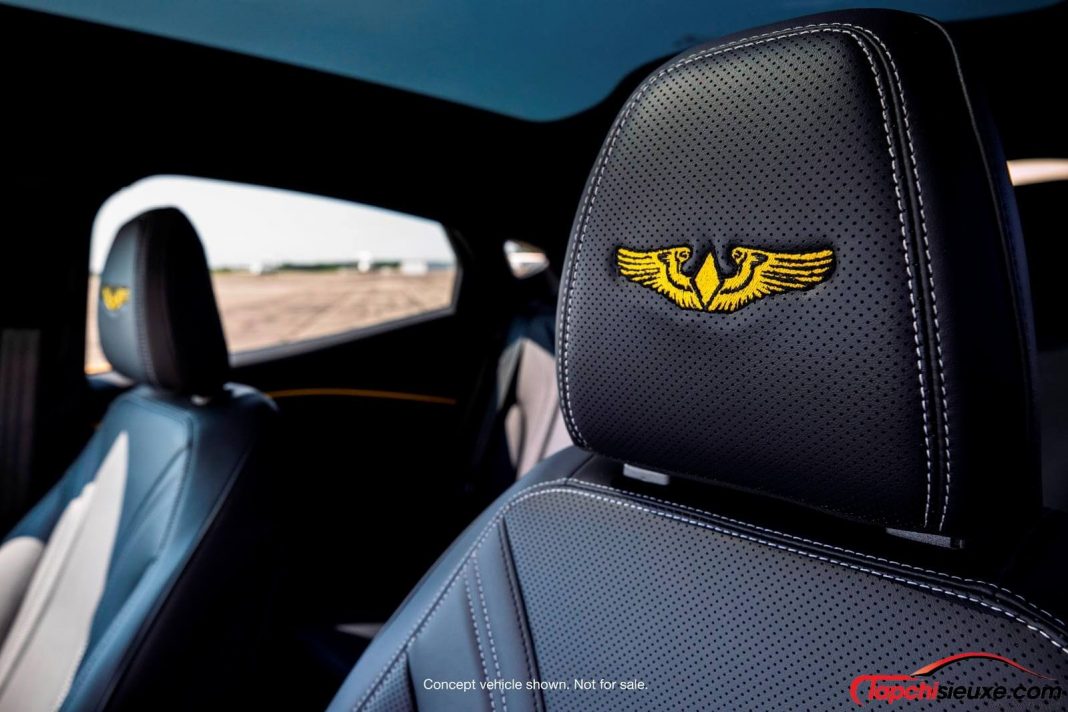 Bên trong, nội thất cũng có nhiều chi tiết màu vàng đậm trên tabi cửa, bảng điều khiển và vô lăng. Logo cánh đại bàng được thêu trên tựa ghế, bệ bước chân có khắc dòng chữ EAA AirVenture.